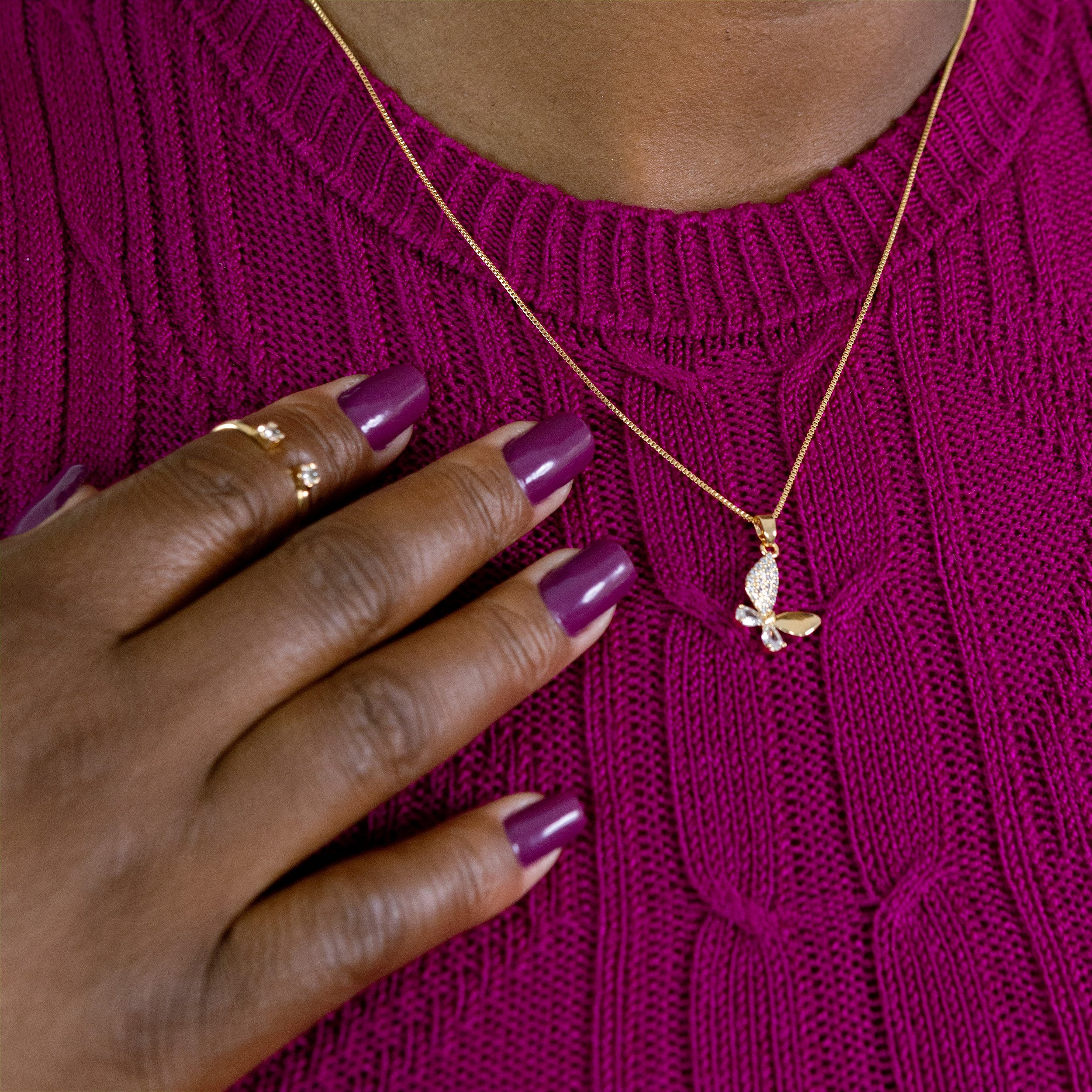 Adicione o cordão pingente de borboleta com zircônias ao seu carrinho agora e transforme seu visual com uma semijoia que vai realçar sua confiança e beleza única. Compre hoje e receba com frete rápido e embalagens especiais – porque você merece se sentir única todos os dias.