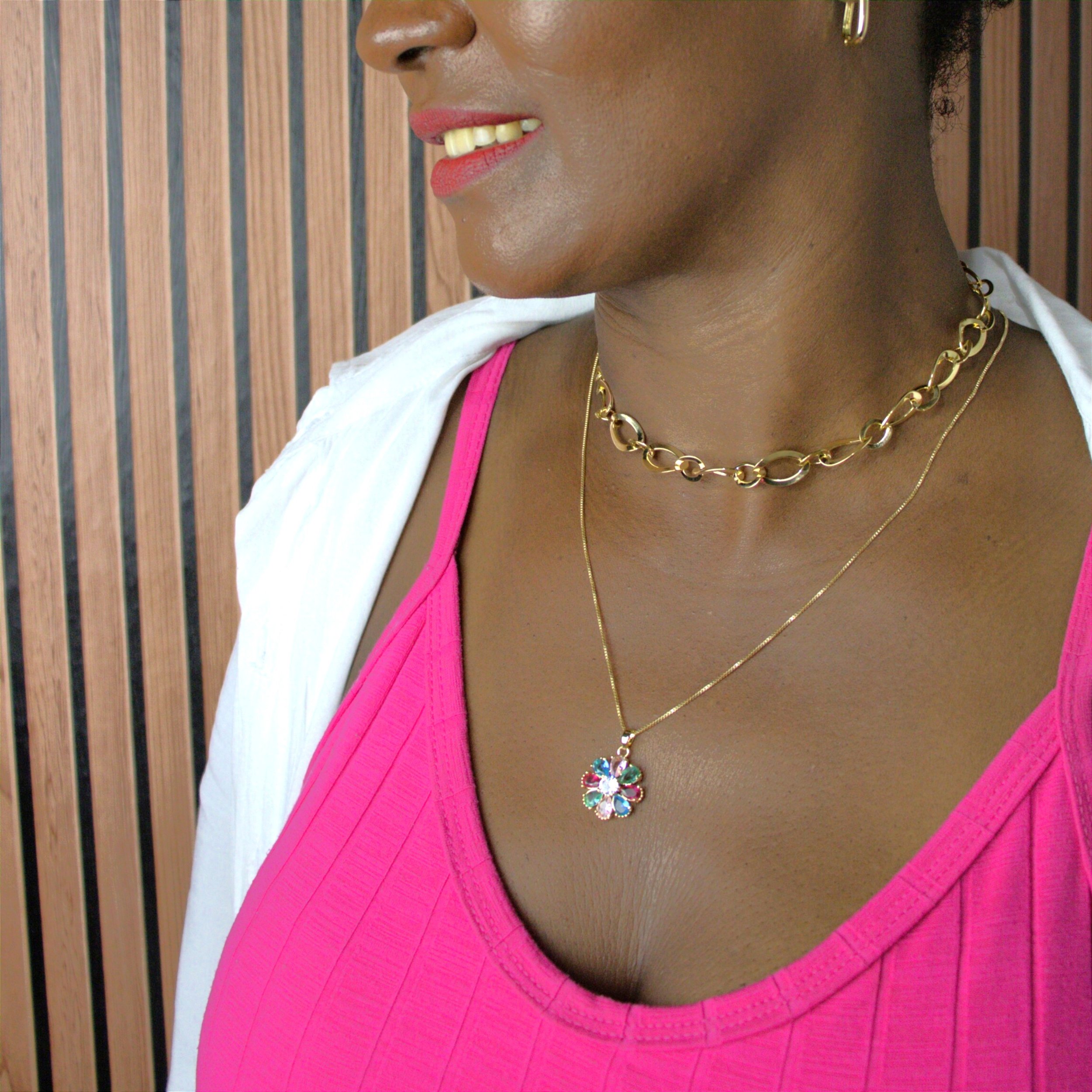 • Design: com uma flor toda cravejada de zircônias coloridas, este colar é ideal para usar sozinho ou fazer composição com outros cordões, ele tem um design elegante e ao mesmo tempo versátil, criando um brilho deslumbrante que vai iluminar seu visual. Perfeito para quem busca sofisticação com um toque delicado e qualidade;