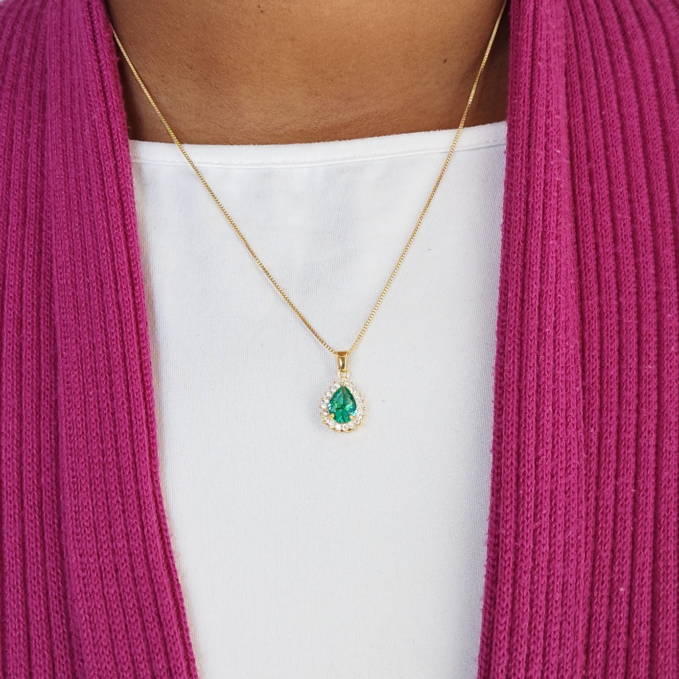 Colar com zircônia formato gota. Zircônia na cor verde cravejada com várias zircônias na cor cristal. Acompanha corrente veneziana de 40cm + 0,5cm de extensor.
