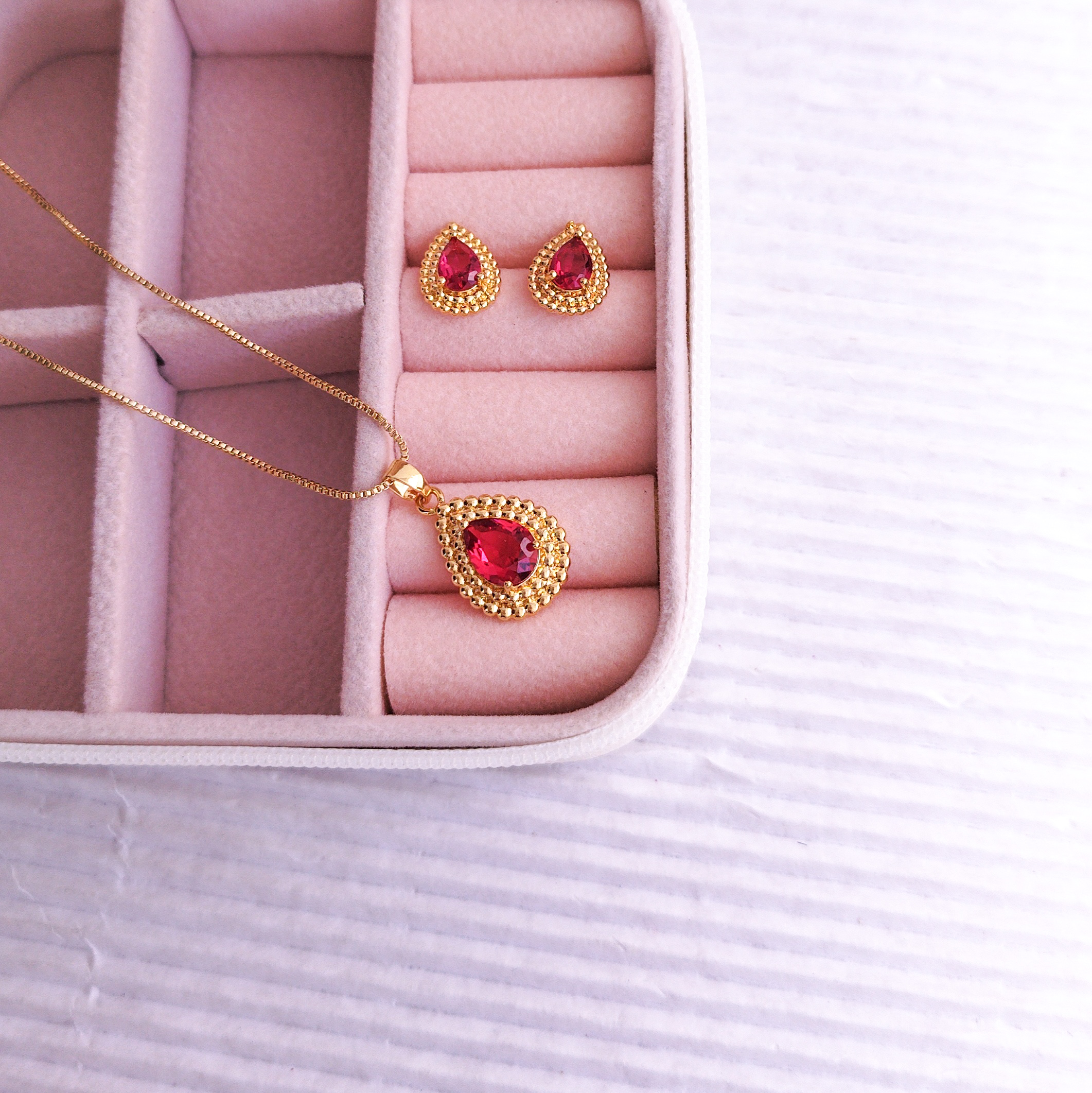 Conjunto cordão e brinco formato gota com zircônia vermelha: beleza, sofisticação e elegância em cada detalhe!