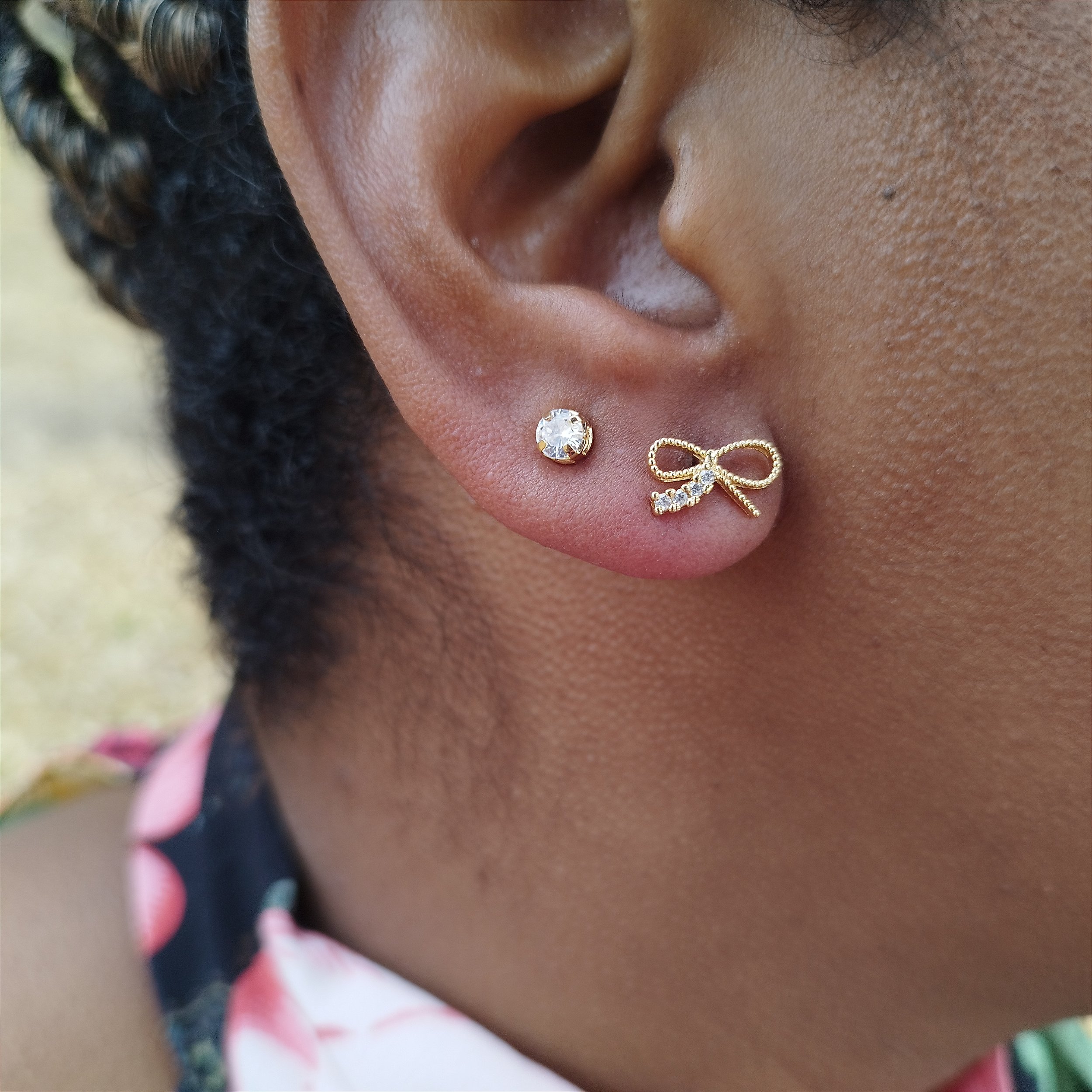 Duo de brinco laço com zircônia e um ponto de luz: um toque de elegância que dura